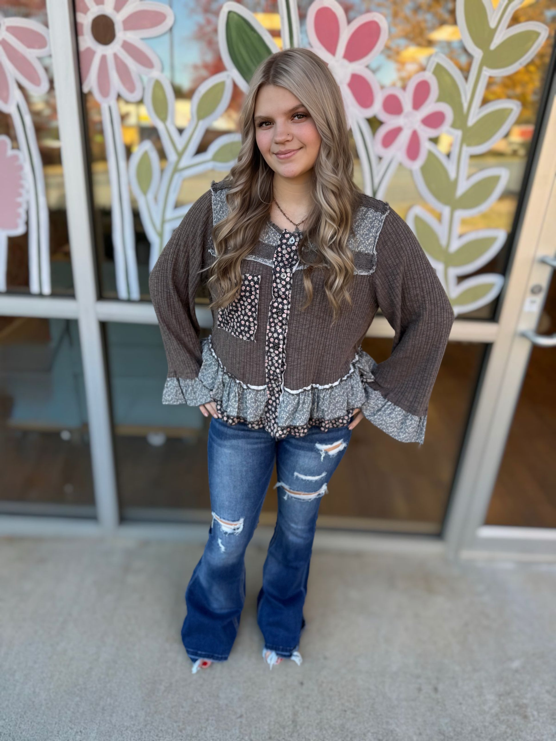 Designed in round neck, long sleeve, ruffle hem, relaxed fit top in rib with floral print.