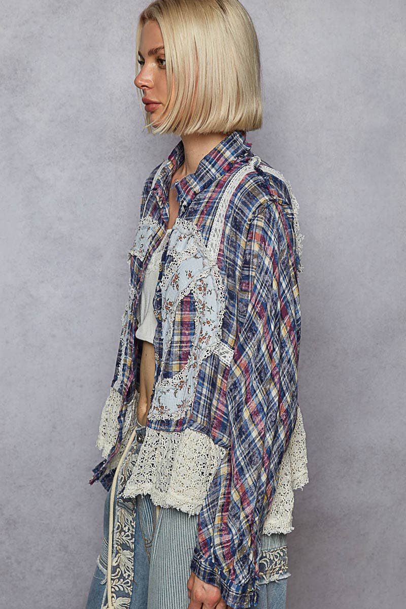 Designed in long sleeve regular fit shirt top in lace patch, trim point, printed double gauze peace patch, outseam, rawedge crochet ruffle with shirring opening, vintage washing, plaid pattern.