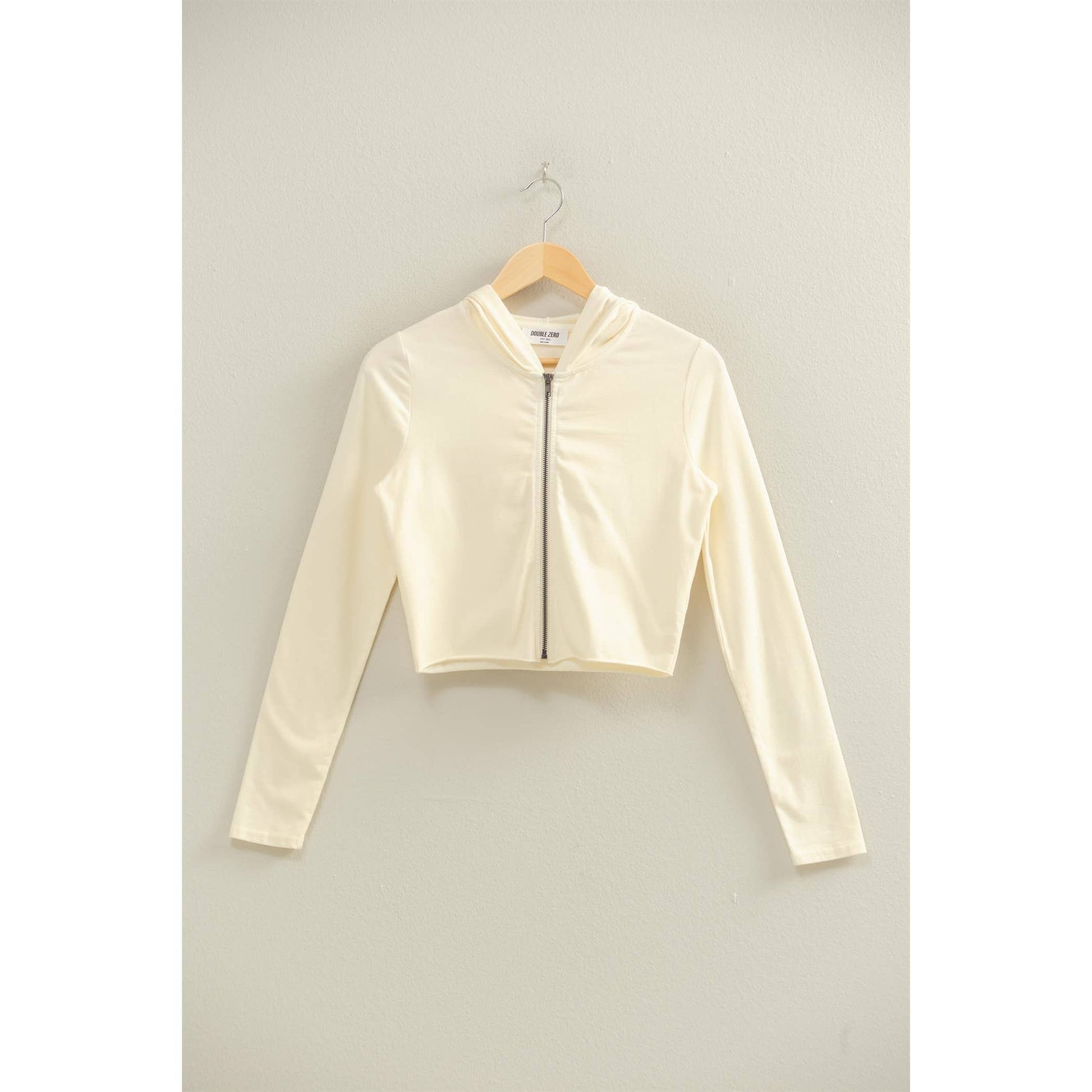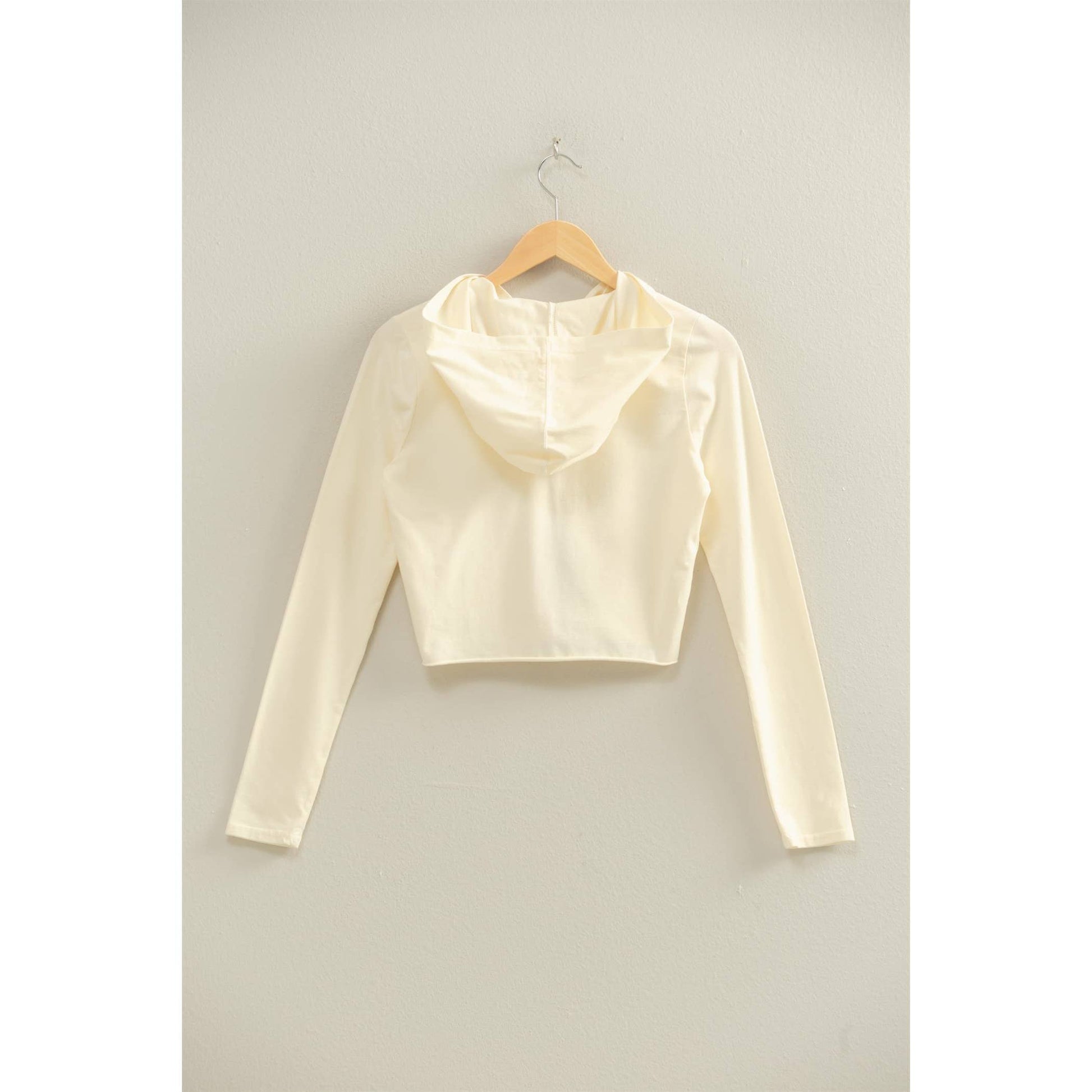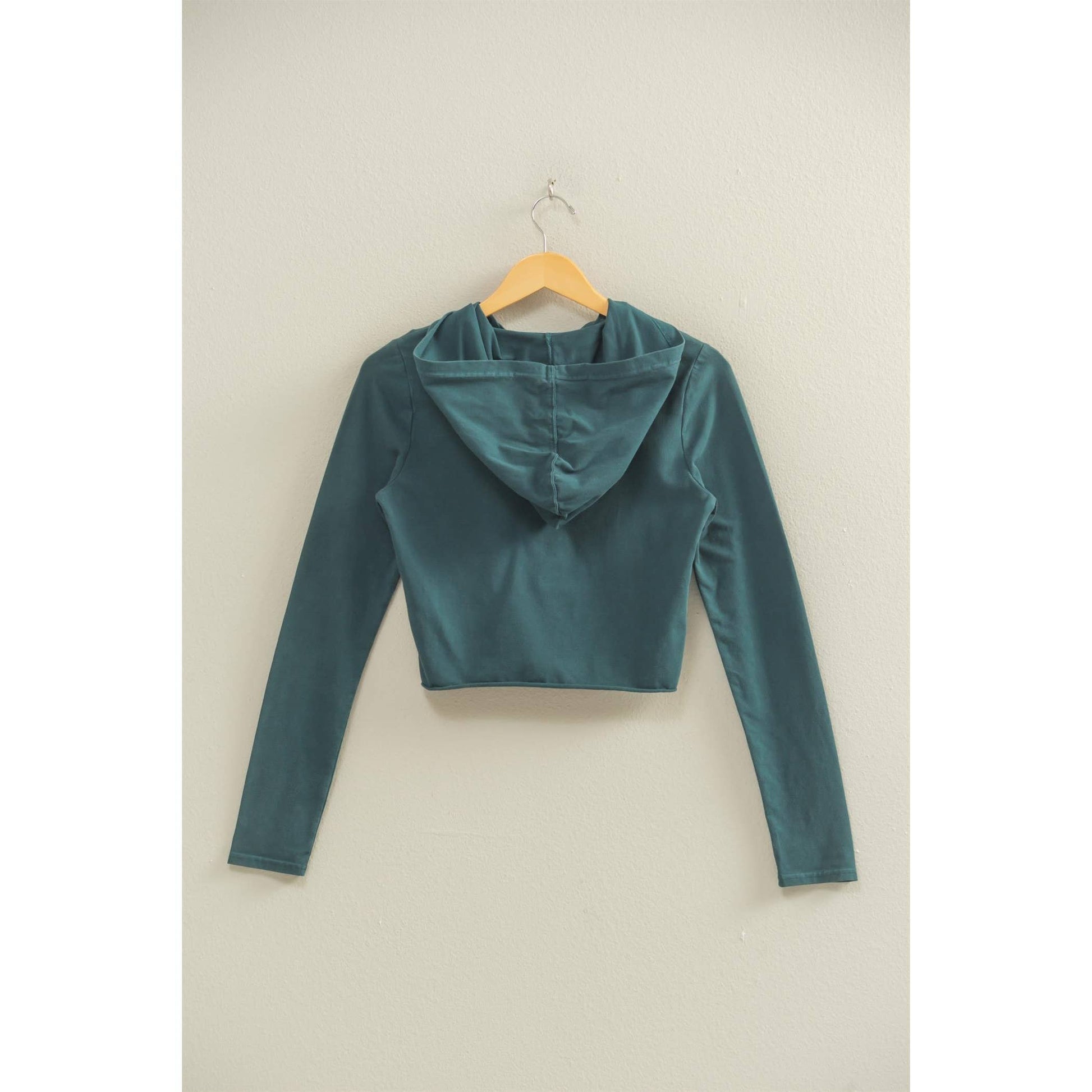 They'll surely do a double take when you walk by wearing this hoodie! In a cropped silhouette, it's tailored with a hooded neck, long fitted sleeves and a zipper-front bodice with a raw edge cut hem. Stretchy fabric allows you to move with ease. 92% Cotton 8% Spandex lmported. Designed in the USA